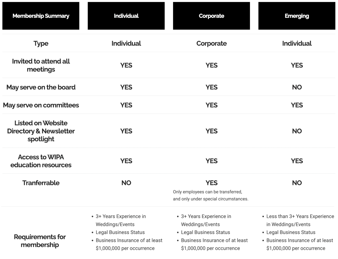 The Emerging Membership is an individual membership created for those who have been in the wedding industry for fewer than three years. This membership is $275 and includes one non-transferable membership. Once you reach three years of industry experience, you may upgrade to an Individual or Corporate membership.